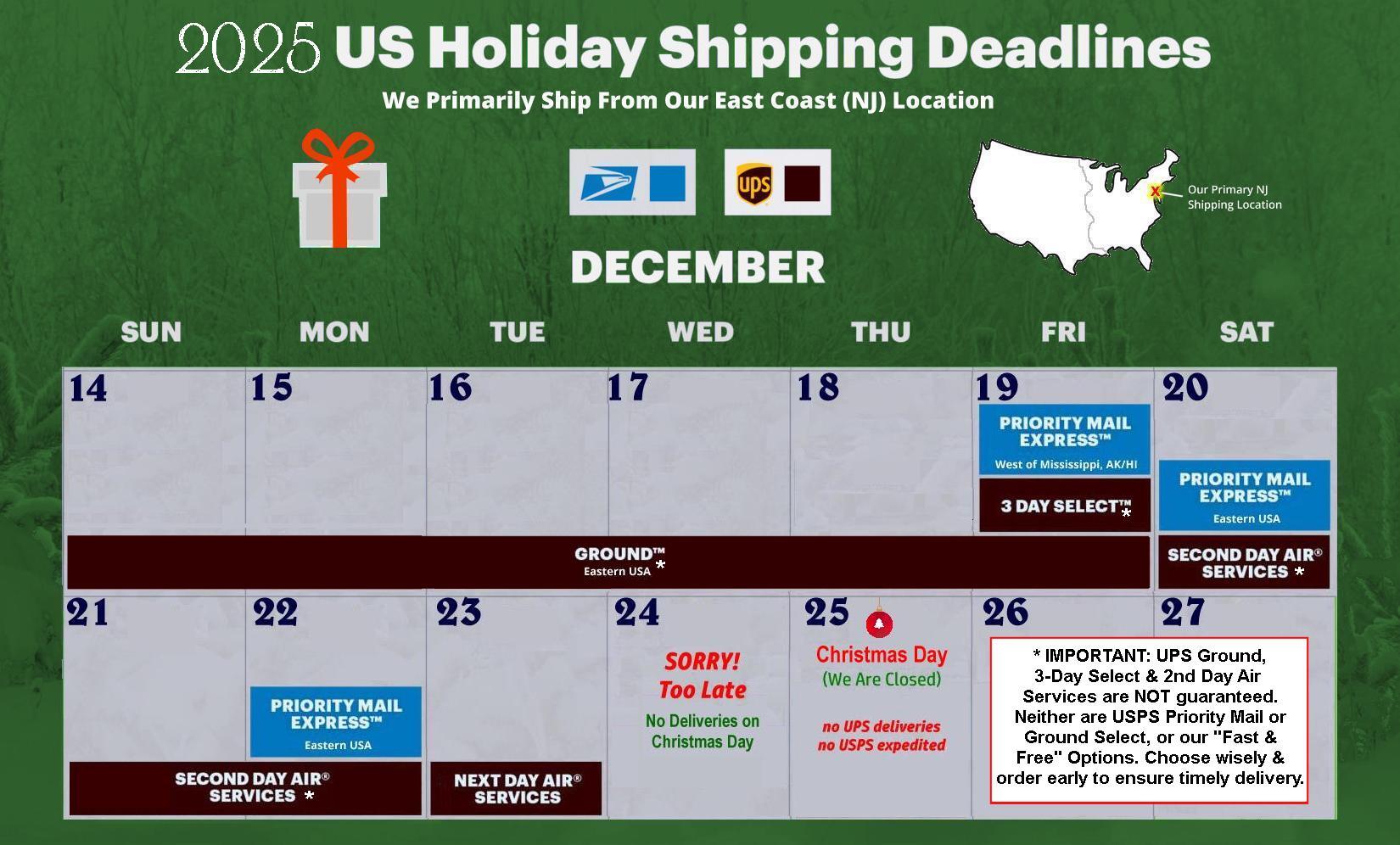 Below, please see the calendar, showing the "deadline" dates for ordering via various shipment services, and still getting gifts in time for Christmas. It is a GUIDE, not a guarantee, especially as it pertains to USPS non-guaranteed services like Ground Advantage and Priority Mail. Also, it's important to note that UPS no longer guarantees 2nd Day Air or 3-Day Select services. (My argument is, why have day-definite services without a guarantee, but I digress...)